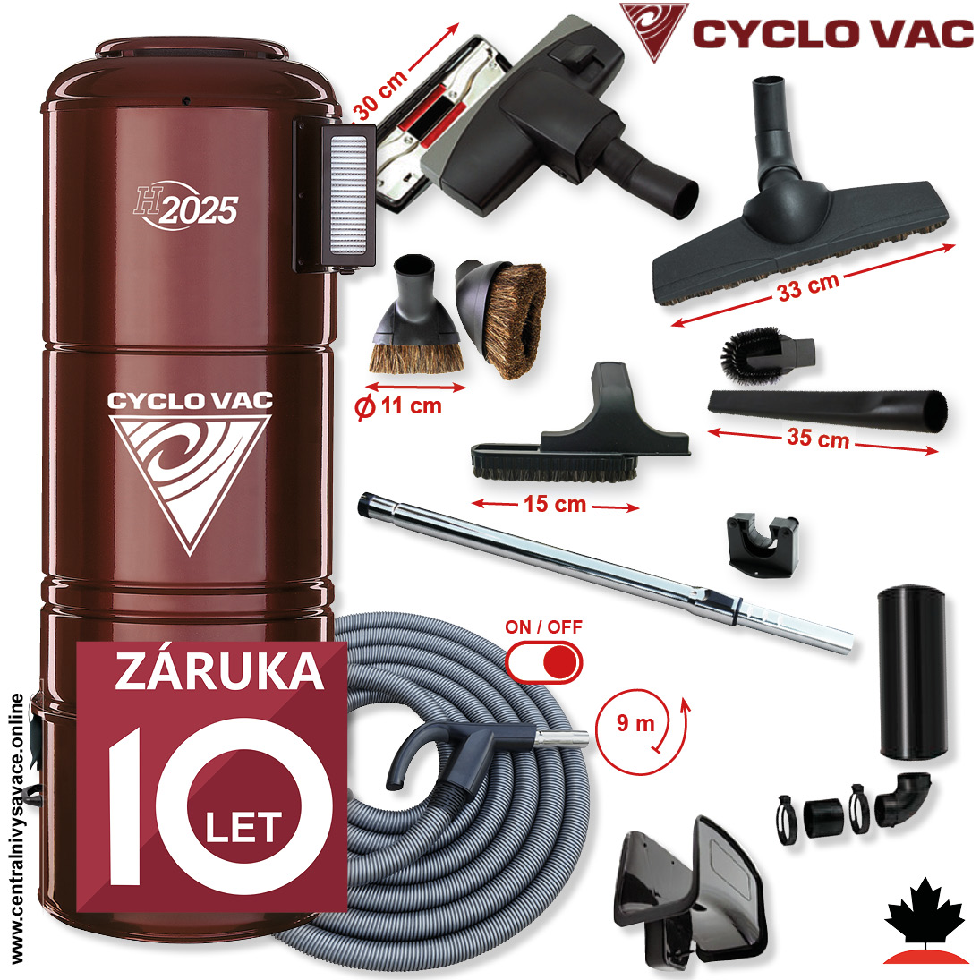 Centrálny vysávač CYCLOVAC H2025 (750 AW) + Sada príslušenstva STANDARD s hadicou 9,1 m (10 ks). Záruka 10 rokov.